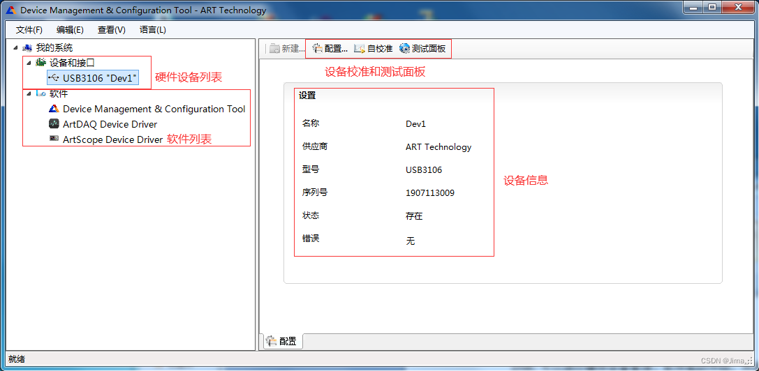2. 在DMC中,可以实现设备识别、属性配置、板卡自校准等功能,并且提供了专业的测试面板,用于快速演示板卡功能。