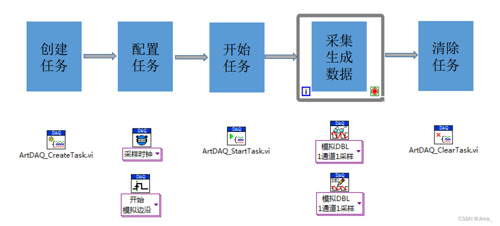 下图列举采集或输出功能的开发流程,整个过程只需要几个函数就可以完成,流程设计符合主流测试测量产品的操作习惯。