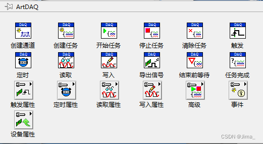 ArtDAQ 开发套件提供内嵌到LabVIEW函数选板的API接口,如下图所示,从函数的图标,即能了解部分函数的功能,相较于直接用库节点调用DLL的编程方式,更符合图形化的编程理念,编程更为方便;