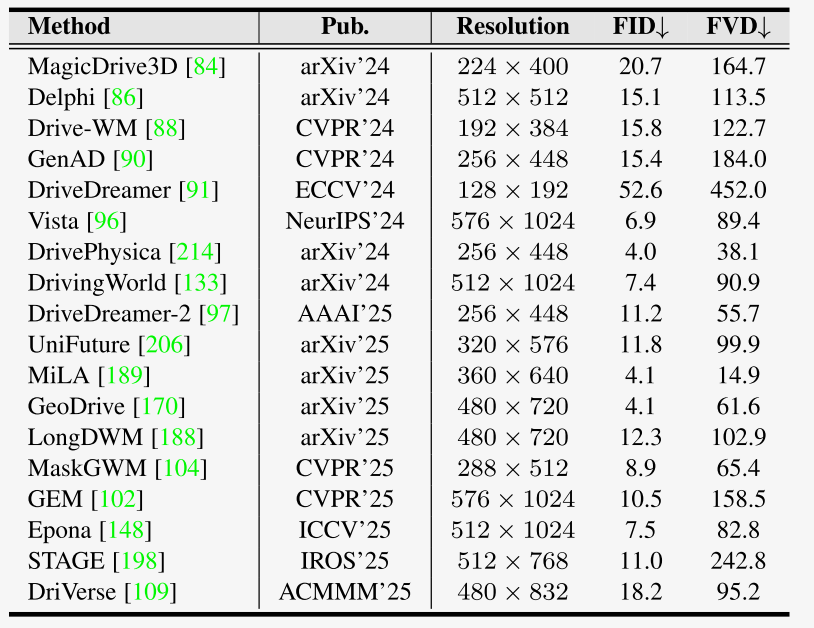 世界模型的视觉建模能力,直接决定了它能否成为一个合格的“环境模拟器”。其中基于nuScenes数据集的视频生成任务,竞争异常激烈,而衡量模型优劣的,是两个“硬指标”:视觉保真度和时序一致性。