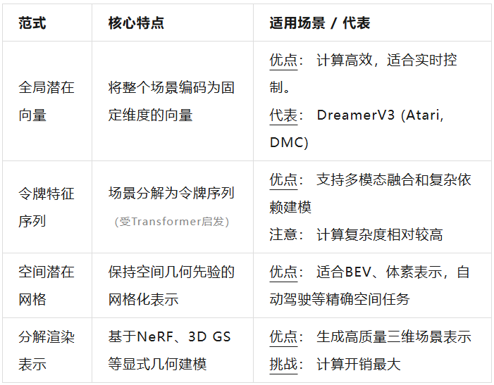 下图也提供了详细的汇总,清晰地总结了每种方法的优缺点和适用场景,是理解世界模型空间表示的指南。