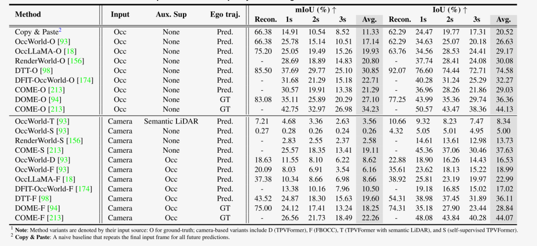 使用真实占据信息作为输入的方法,比仅依赖纯视觉的方法性能显著更优。这强调了几何先验信息对世界模型进行精确空间理解的极端重要性。