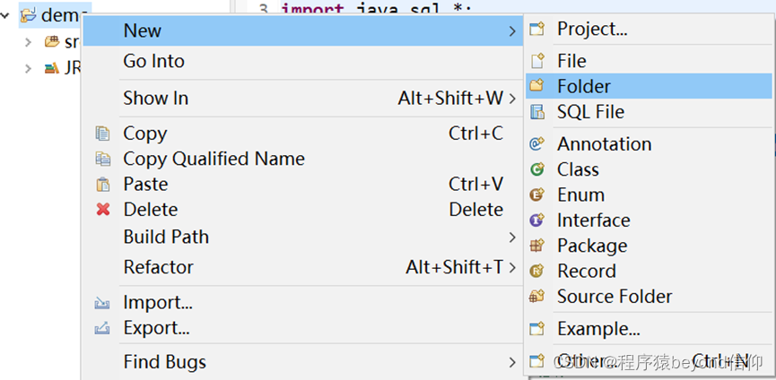 第一步、在项目下创建一个文件夹,保存jar包。项目名右击,点击【New】【Floder】,打开新建文件夹窗口。输入文件夹名称【lib】,点击【ok】。在文件夹中存放从外部引入的jar包。