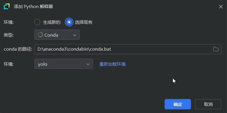 随后设置环境为我们之前创建的yolo,点击确定即可。随后就会加载我们之前在yolo环境里配置的包。