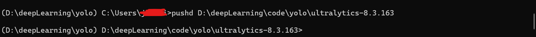 其中pushd <一个文件夹路径> 这个指令类似于cd指令,运行后可以进入文件夹,相比cd,pushd的好处是可以直接进入其他盘。
