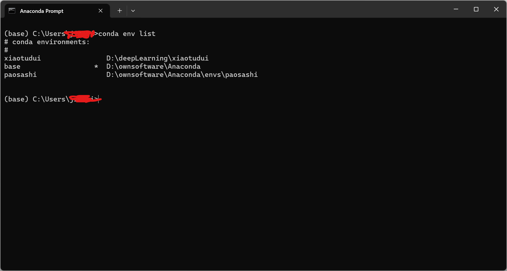 首先打开andconda终端,随后输入下面指令查看当前conda环境,这里由于博主已经创建好了其他环境,所以会有多个显示,正常情况下,应该只有一条base环境