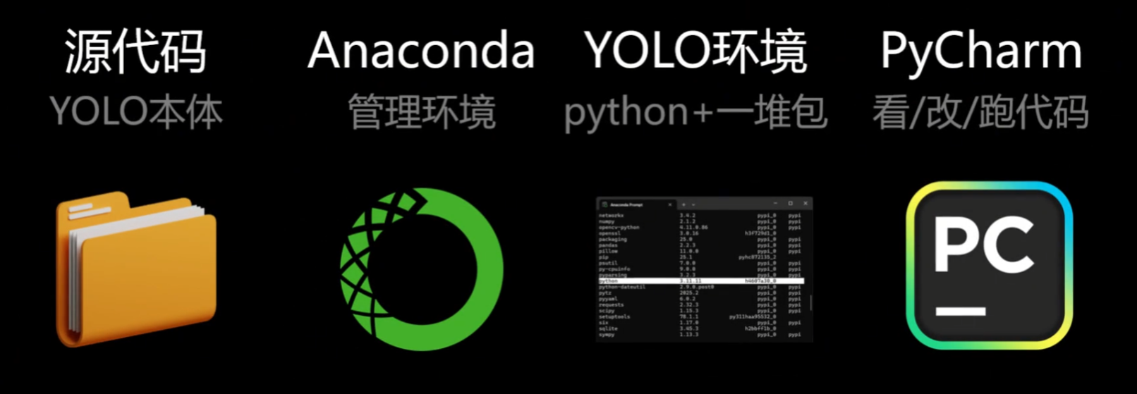 实际上我们在配置YOLO环境时,只需要配置两样东西:yolo源代码和python及所需的各种包(称为python环境)