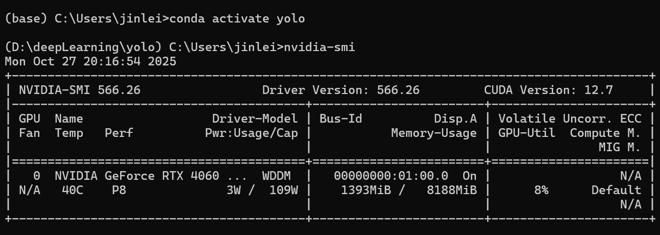 随后输入,当出现下面的内容,并且开头的base变成了yolo就表示我们的环境激成功了。