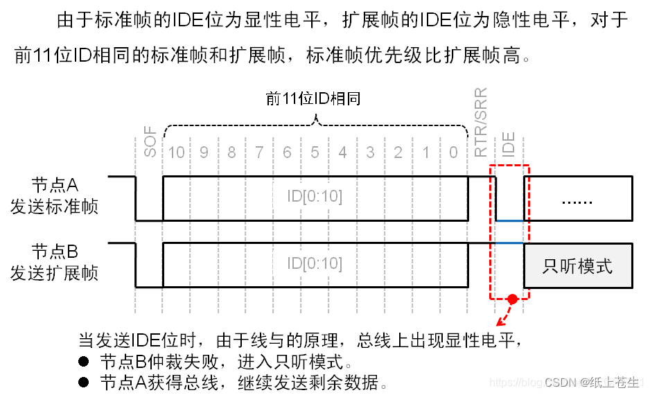 - 仲裁过程:CAN总线上多个节点可能同时发送消息。CAN控制器通过标识符的仲裁机制确定优先级,ID值越低优先级越高。