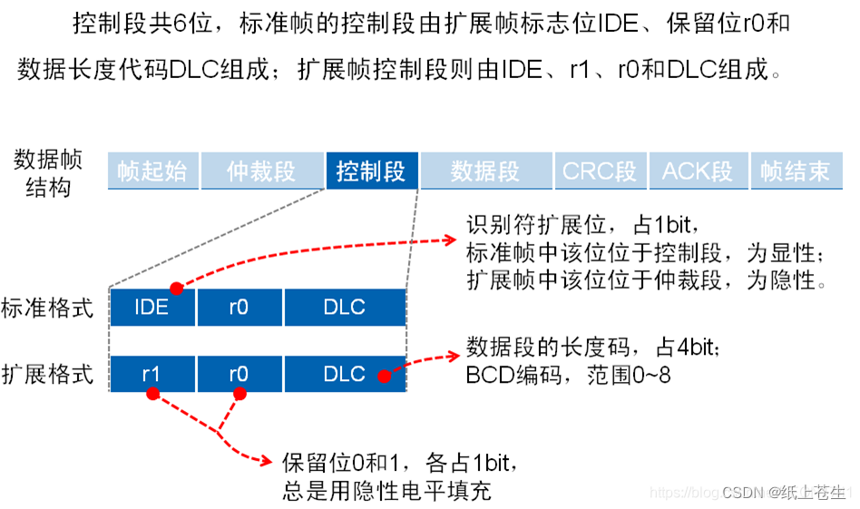 结构上由7个段组成,其中根据仲裁段ID码长度的不同,分为标准帧(CAN2.0A)和扩展帧(CAN2.0B)。