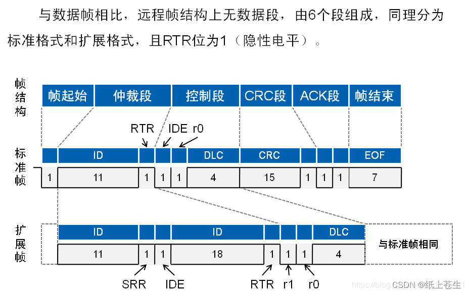 对于同为扩展格式数据帧、标准格式远程帧和扩展格式远程帧的情况同理。