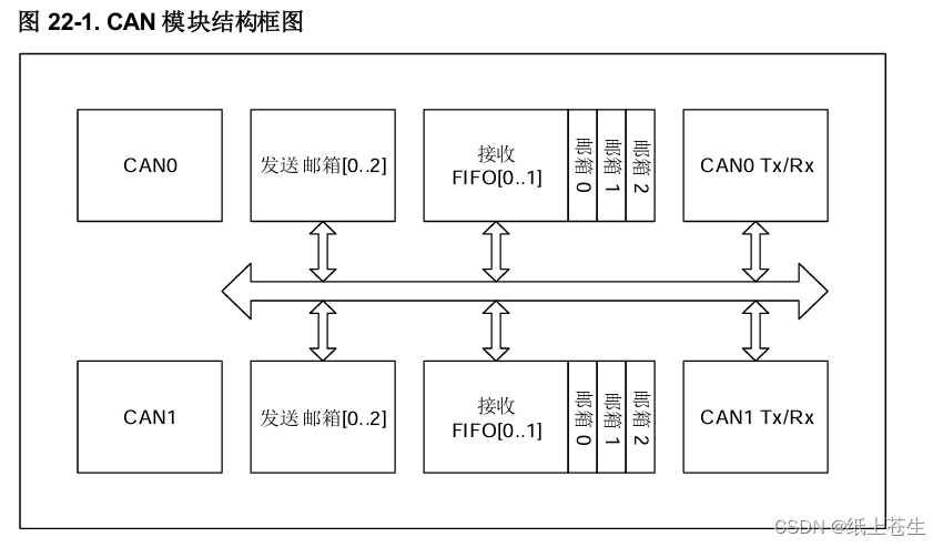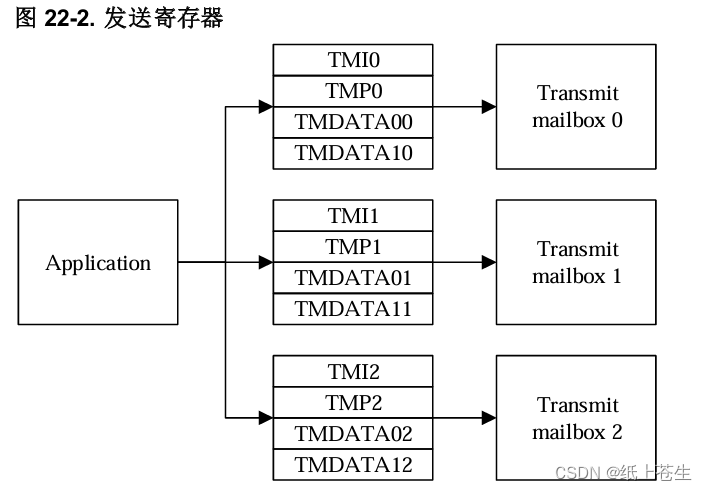 发送寄存器 数据发送通过3个发送邮箱进行,可以通过寄存器CAN_TMIx,CAN_TMPx,CAN_TMDATA0x和CAN_TMDATA1x 对发送邮箱进行配置