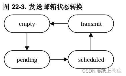 当发送邮箱处于empty 状态时,应用程序才可以对邮箱进行配置。当邮箱被配置完成后,可以将CAN_TMIx寄存器的TEN位置 1,从而向CAN总线控制器提交发送请求,这时发送邮箱处于pending状态。当超过1个邮箱处于pending状态时,需要对多个邮箱进行调度,这时发送邮箱处于scheduled 状态。当调度完成后,发送邮箱中的数据开始向 CAN总线上发送,这时发送邮箱处于transmit 状态。当数据发送完成,邮箱变为空闲,可以再次交给应用程序使用。