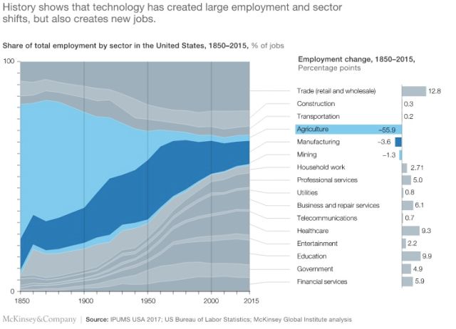 在2017年1月关于自动化报告的基础上,麦肯锡全球研究所发布了报告《失业与就业:自动化时代的劳动力转型》,评估了到2030年,在不同情况下可能创造的工作岗位的数量和类型,并将其与可能被自动化所取代的工作岗位进行了比较。