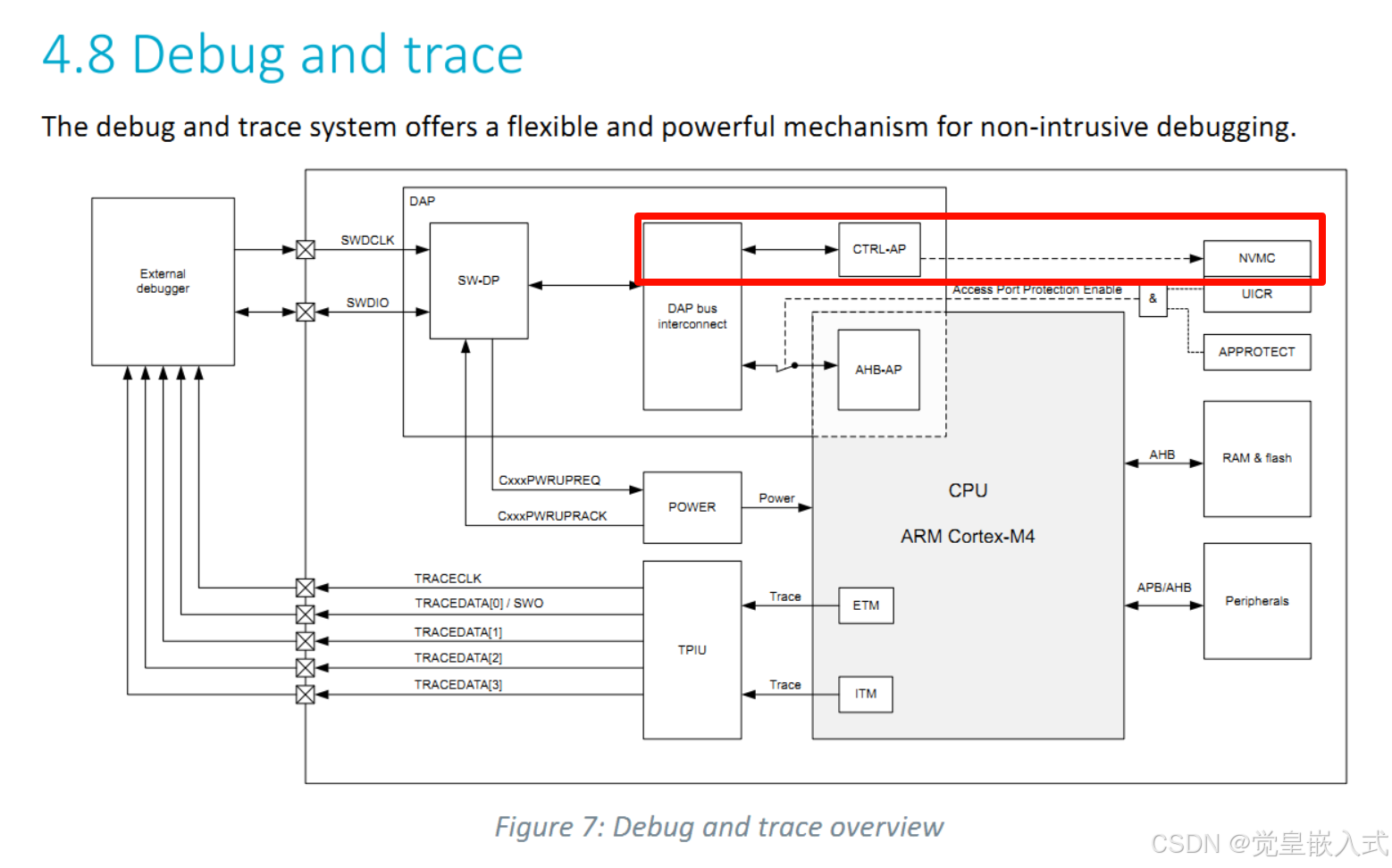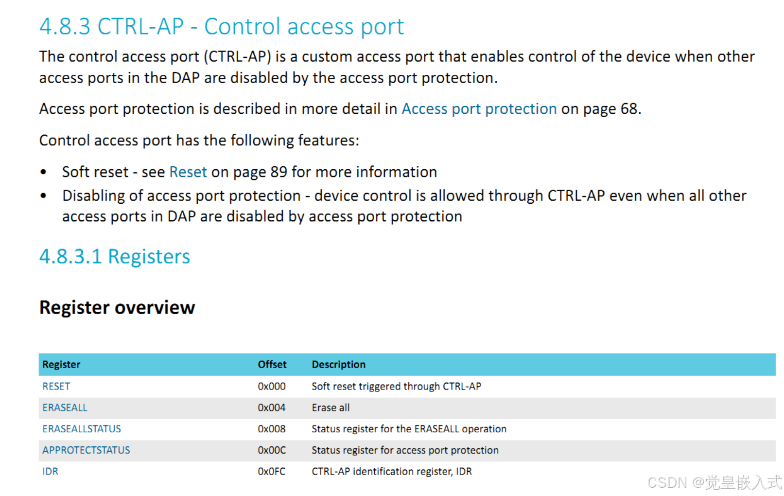 该芯片的调试组件框图如上图所示,可以看到,开启读保护后虽然无法访问到了挂载在AHB总线上的外设(如FLASH、RAM、外设等)。但是还有另外一组CTRL-AP,这个AP是可以访问到NVMC控制器的,并且CTRL-AP下存在一个ERASEALL寄存器,通过访问该AP并操控ERASEALL触发全片擦除操作,就可以解除读保护了。