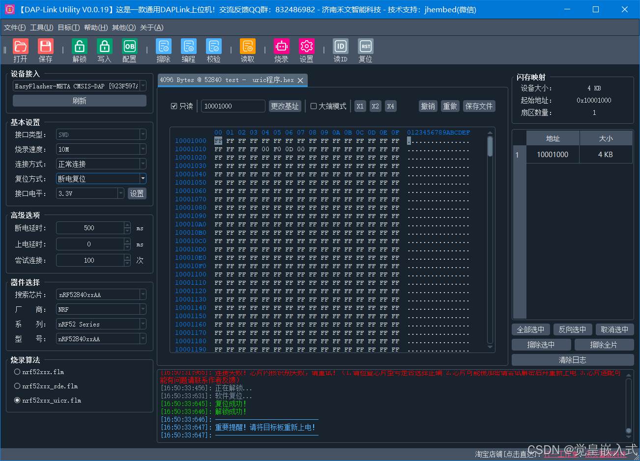 DAPLink上位机升级至V0.0.19版本,新增三大亮点功能:上电复位、断电复位和固件升级支持,为二次烧录和选项字节配置提供便捷解决方案。新增支持NRF52、凌鸥LKS32MC03x、上海芯圣HC32F06等20余款芯片的读写保护烧录算法,优化了界面布局和日志显示等功能。重点介绍了NRF52系列通过CTRL-AP实现读保护解除的创新方法,以及LKS32MC03x通过FLASH末字节设置保护的独特