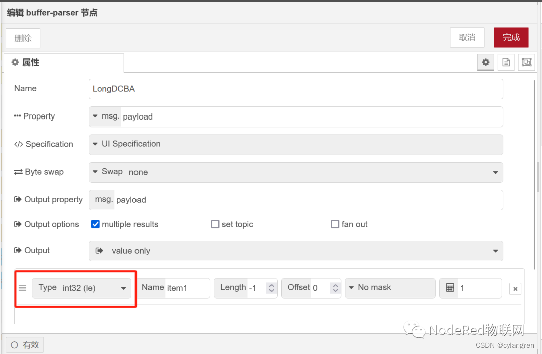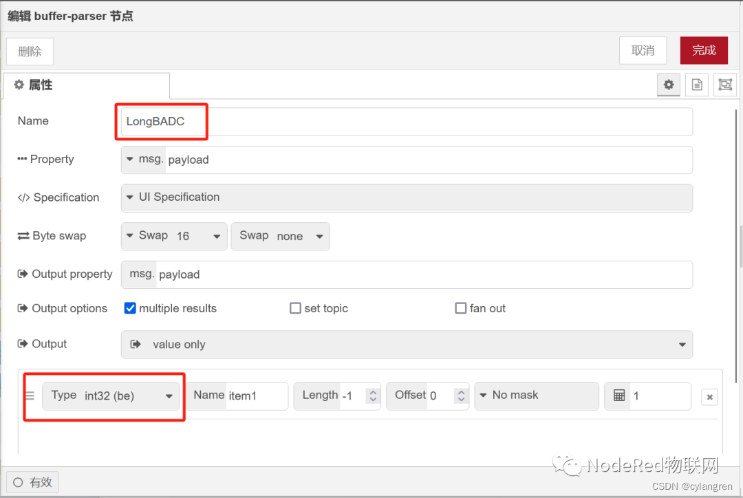 回到Red-Red工作区,复制Unsigned节点及其后的debug2节点,并将其与Modbus-Getter节点连接,双击刚复制的Unsigned节点,修改Name为“LongABCD”,修改解析类型为“Type int32 (be)”,其余保持不变,