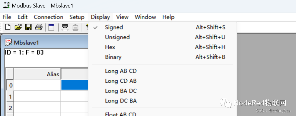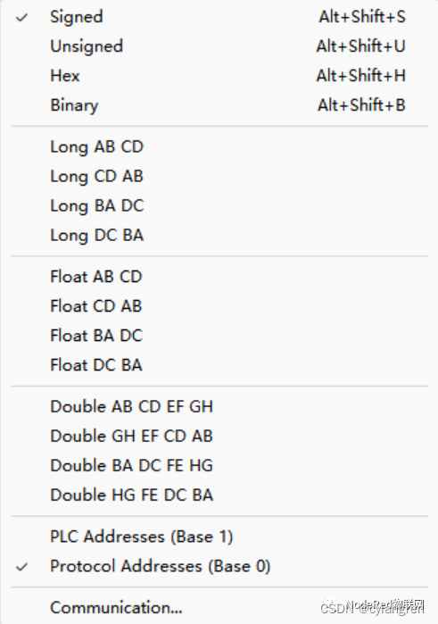 Modbus Slave支持Signed、Unsigned、Hex、Binary、Long、Float、Double等多种数据类型,如图所示,后面我们将一一说明。