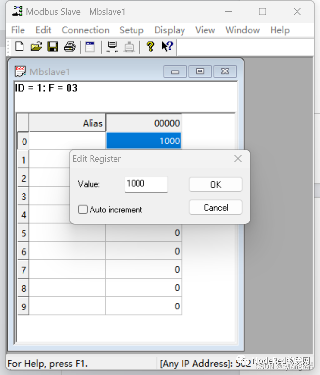 注意:Modbus Slave软件中设置的寄存器类型需与Node-Red中允许显示的节点类型保持一致。