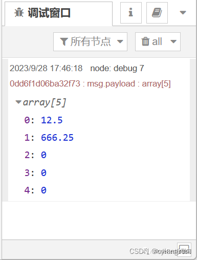 回到Node-Red,点击inject节点触发一次流,读一次数据,可以看到调试面板显示如下: