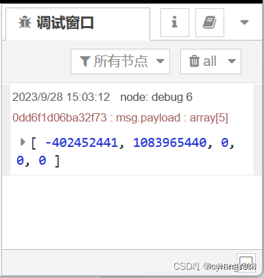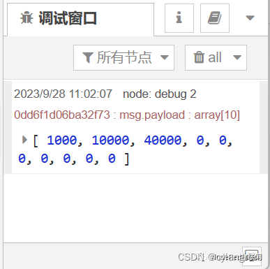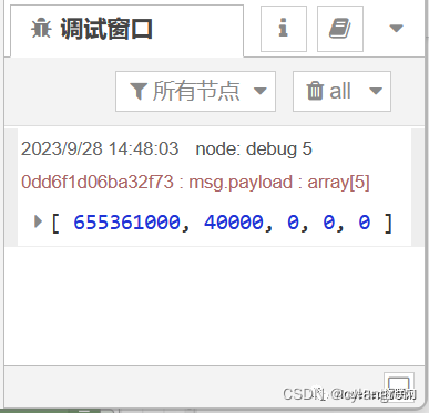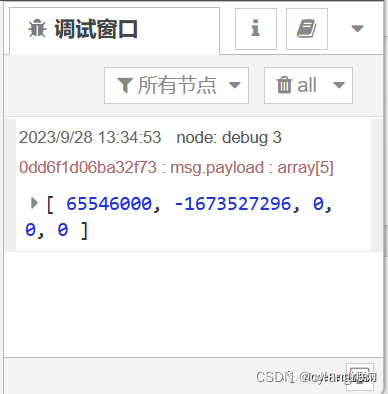 通过点击inject(时间戳)节点触发一次流,可以在调试面板看到,解析的数据与Modbus Slave软件中设置的一致。