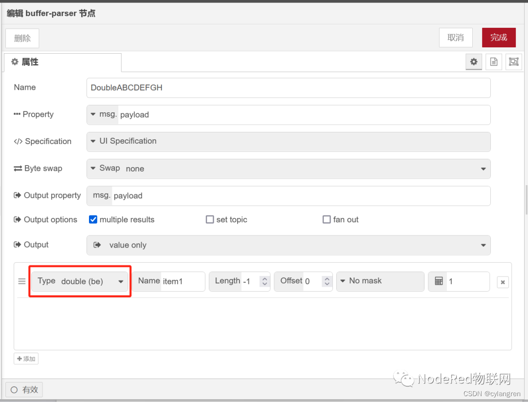 双击复制的FloatABCD节点,将其改名为DoubleABCDEFGH,修改数据解析类型为“Type double (be)”,点击“完成”按钮确定修改。