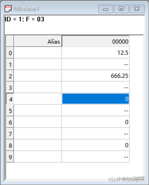 修改Modbus Slave软件中寄存器类型为DoubleABCDEFGH,在寄存器中输入两个数据12.5和666.25。