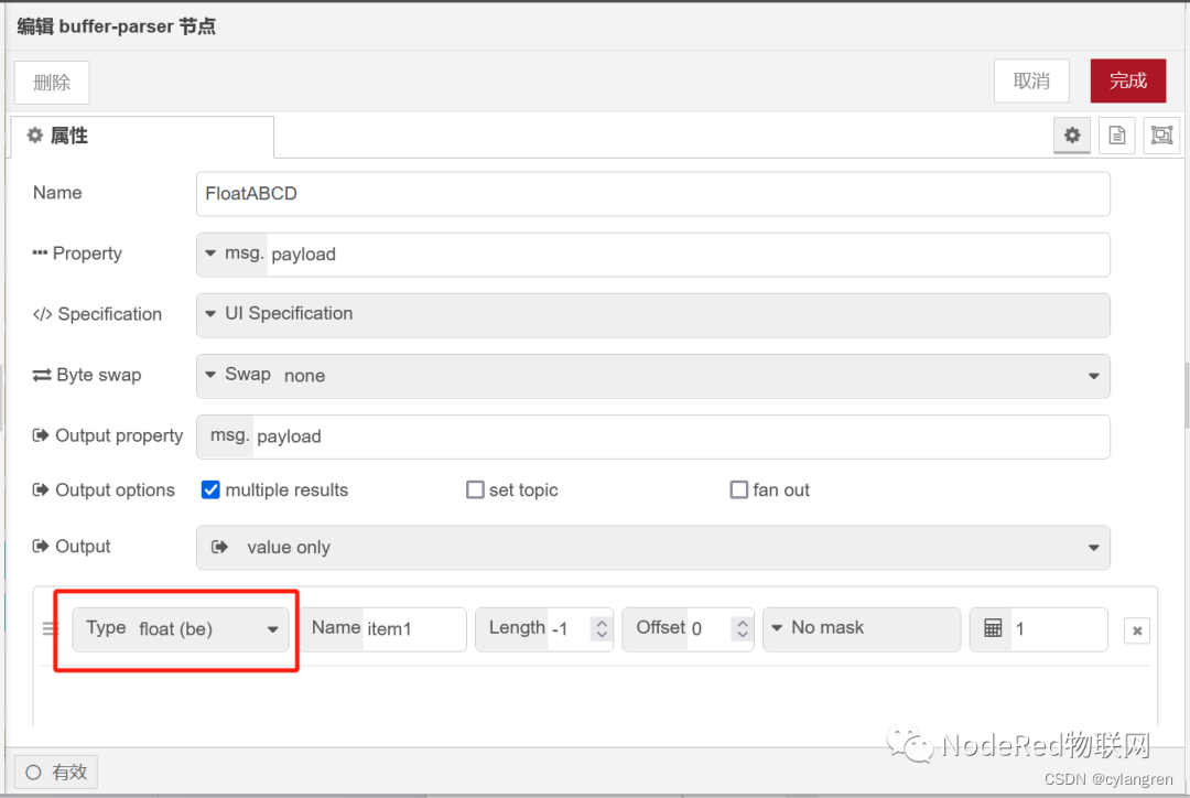 双击FloatABCD节点,将数据解析类型修改为“Type float (be)”,如下图所示,