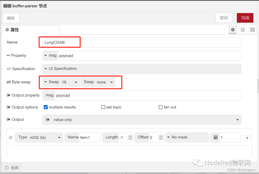 在Node-Red中复制LongDCBA节点及其后的debug4节点,并将其与Modbus-Getter节点连接,双击刚复制的LongDCBA节点,修改Name为“LongCDAB”,Byte swap选择“Swap 16”,其余保持不变,