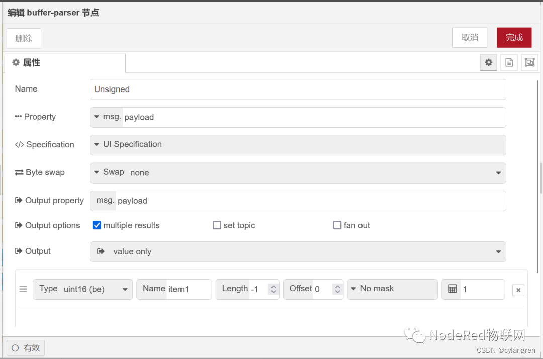 双击buffer-parser节点进行配置,Name设置为“Unsigned”,勾选“multiple results”选项,最下面的解析类型选择“Type uint16 (be)”,Length改为“-1”,其余保持默认值,点击“完成”按钮确定,并部署流程。