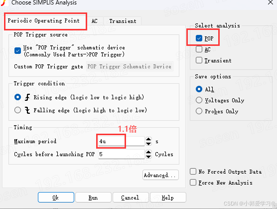 周期性工作点 (POP) 分析是一种独特的分析模式,可快速找到周期性开关系统的稳态工作波形。为了让 POP 分析找到稳态工作点,SIMPLIS需要知道原理图上的哪个节点代表最低周期频率,然后使用POP 触发器连接至最低周期频率节点。一般来说,储能元件上都可以表现出最低周期频率,所以下图的POP触发器可以连接在任何储能元件上。也可以连接在PWM调制器中的产生波形发生器上。