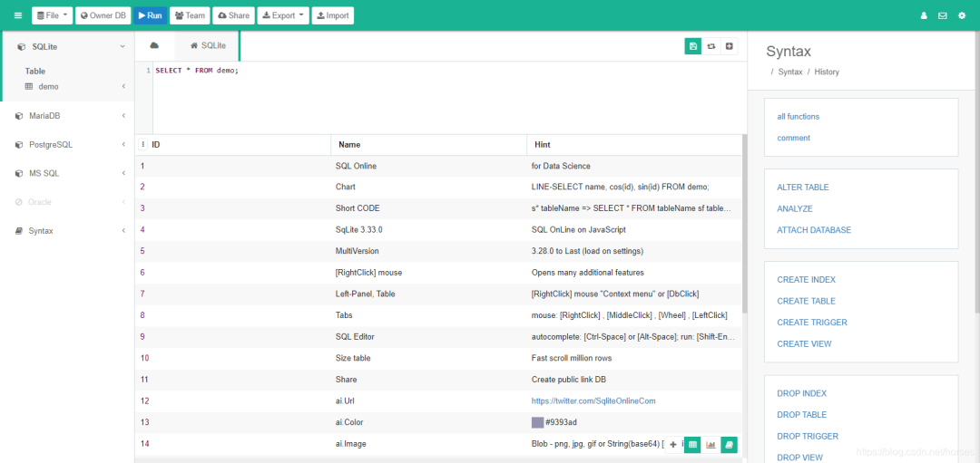 另外,“Share”用于生成共享链接,需要注册一个免费账号才能使用。以上截图的地址为: https://sqliteonline.com/#fiddle=b10c1ad462ac37386ac200341b7bd05758a7059321bd675ecb6c2ed7aa563f38。