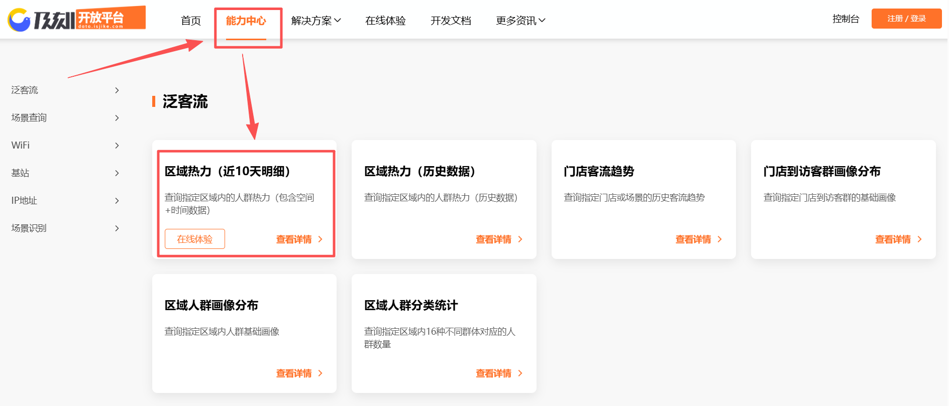 1、注册平台账号,然后在能力中心页找到“泛客流”栏目,找到“区域热力(近10天明细)API”;