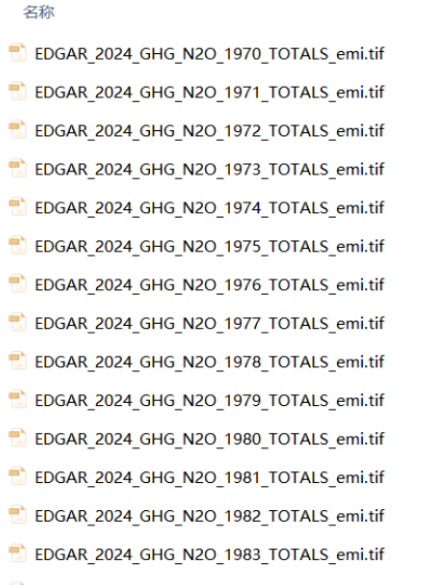 其中,文件夹名字中包括“emi”的为排放总量,文件夹名字中包括“flx”的为排放通量。CO2表示的是化石CO2排放,CO2bio表示的是生物CO2排放。每个文件夹包括该指标的逐年的栅格数据,我们以文件夹“N2O_TOTALS_emi_tif”为例,打开看一下: