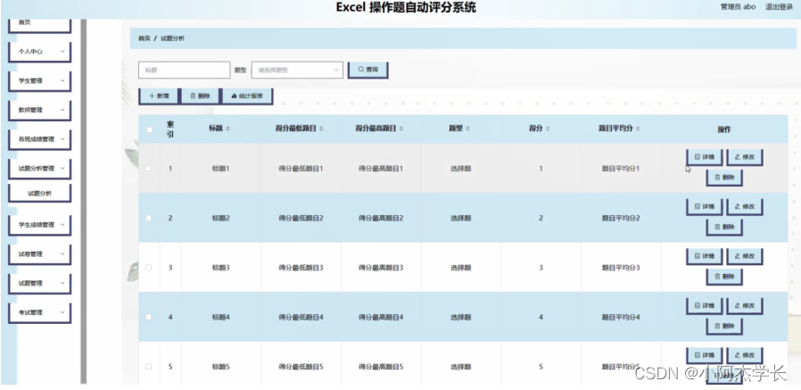 试题分析管理;在试题分析管理页面中可以对索引,标题,得分最低题目,得分最高题目,题型,得分,题目平均分等内容进行详情,修改和删除操作;如图4-6所示。