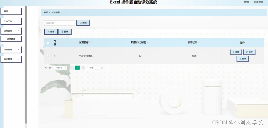 试卷管理,在试卷管理页面通过对索引,试卷名称,考试时长,试卷状态等内容进行详情,修改,删除操作,如图4-8所示。