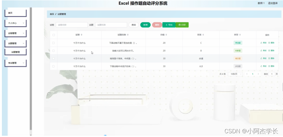 试题管理,在试题管理页面可以对试卷,试题名称,分值,答案,类型等信息,并进行修改,删除等操作;如图4-9所示。
