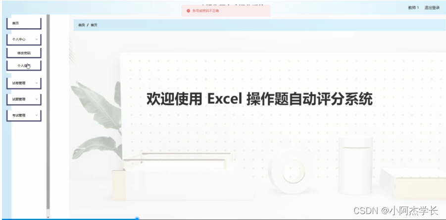 教师登录进入系统可以查看首页,个人中心,试卷管理,试题管理,考试管理等功能,并进行详细操作;如图4-7所示。