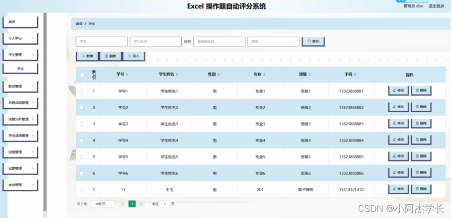 学生管理;在学生管理页面中可以对索引,学号,学生姓名,性别,专业,班级,手机等内容进行修改和删除操作;如图4-3所示。