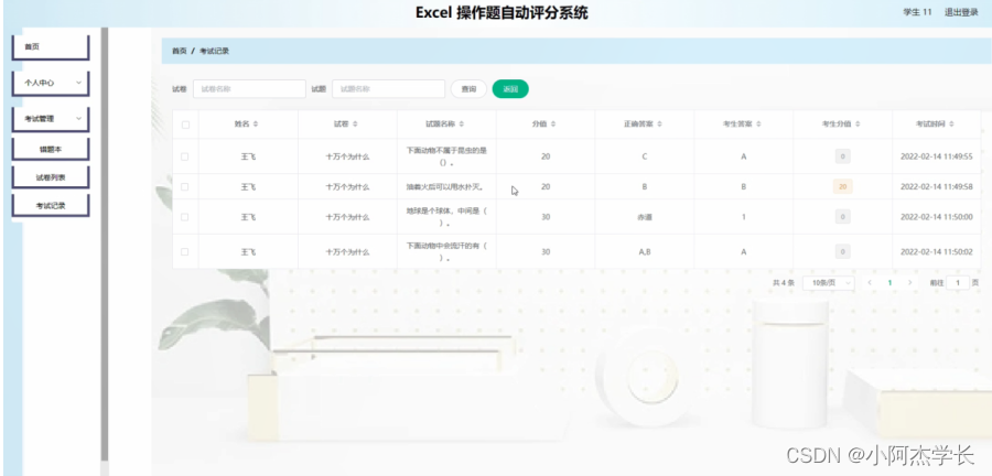 试卷管理,在考试记录页面可以查看姓名,试卷,实体名称,分值,正确答案,考生答案,考试时间等信息进行查看,还可以对错题本,试卷列表进行操作;如图4-12所示。