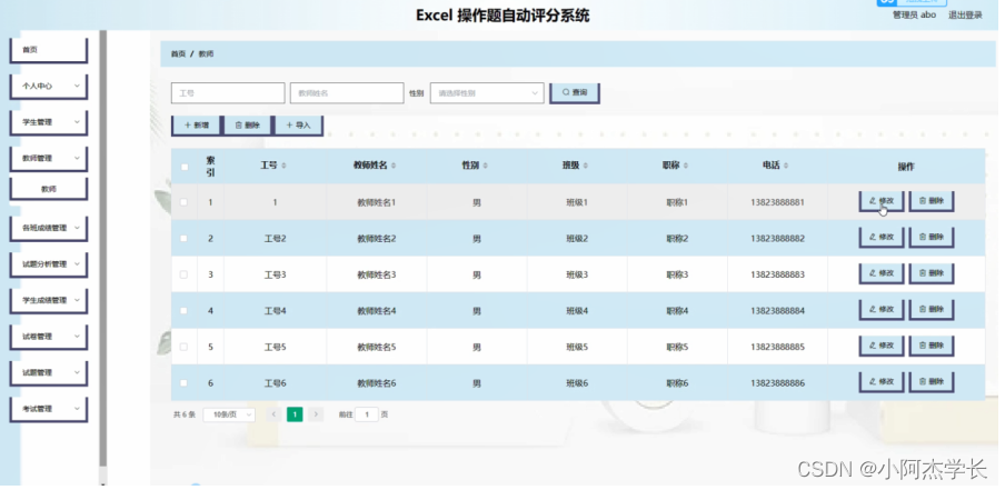 教师管理;在教师管理页面中可以对索引,工号,教师姓名,性别,班级,职称,电话等内容进行修改和删除操作;如图4-4所示。