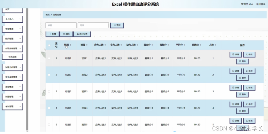 各班成绩管理;在各班成绩管理页面中可以对索引,标题,班级,应考人数,实考人数,缺考人数,最高分,最低分,平均分,分数段,人数等内容进行详情,修改和删除操作;如图4-5所示。