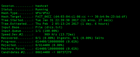 使用aricrack-ng暴力破解8位数密码需要50个小时, 但是使用Hashcat只要1个半小时不到