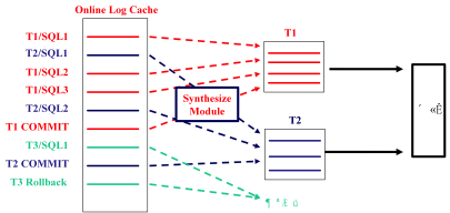 如上图所示,在Online Log Cache文件中,包括Commit的交易,没有Commit的交易和Rollback的交易。交易合成模块首先按照交易序号对SOL语句进行划分,每个交易包含多条SOL语句。然后,以交易为单位进行处理,将已经Commit的交易,传至传输处理模块;将未提交的交易保存在本地,一旦通过日志得知保存的未提交交易已提交,立即将该交易发送到传输处理模块;对Rollback的交易作丢弃处理。