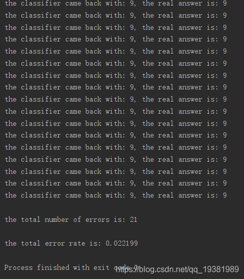 classifierResult = classify0(vectorUnderTest, trainingMat, hwLabels, 9)
