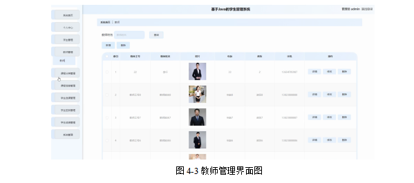 管理员点击教师管理;在教师管理页面对教师工号、教师姓名、照片、年龄、资历、手机等信息,进行查询,新增或删除教师信息等操作;如图4-3所示。