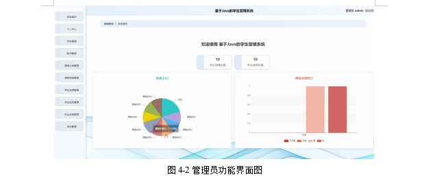 管理员登录进入学生管理系统的实现可以查看系统首页、个人中心、学生管理、教师管理、课程分类管理、课程信息管理、学生选课管理、学生签到管理、学生成绩管理、系统管理等信息,如图4-2所示。