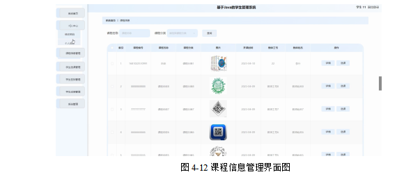 学生点击课程信息管理;在课程信息管理页面对课程编号、课程名称、课程分类、图片、开课时间、教师工号、教师姓名等信息,进行查询课程信息等操作;如图4-12所示。