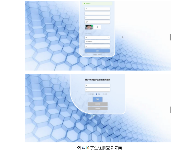 学生注册登录界面,首先双击打开系统,连上网络之后会显示出本系统的注册登录界面,这是进入系统的第初始页面“注册登录”,能成功进入到该注册登录界面则代表系统的开启是成功的,接下来就可以操作本系统所带有的其他所有的功能,如图4-10所示。