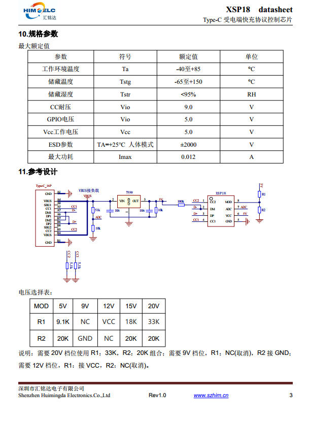 XSP18是通过电阻来选择电压档位,并支持电压档位自动向下兼容,例如需要获取最大电压20V给后端供电,R1使用33K电阻,R2使用20K电阻,连接快充适配器优先获取20V 电压,获取20V失败芯片会自动向下获取15V,以此类推